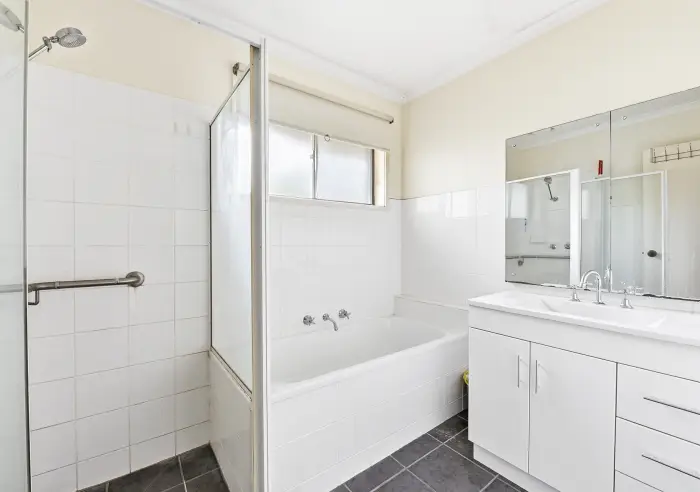 Two bedrooms include built-in robes with Venetian blinds to the main bedrooms. The bathroom features a tiled hob bathtub and framed shower which is complemented by the ceramic top single vanity and spindle tapware. A separate guest powder room adds appeal.