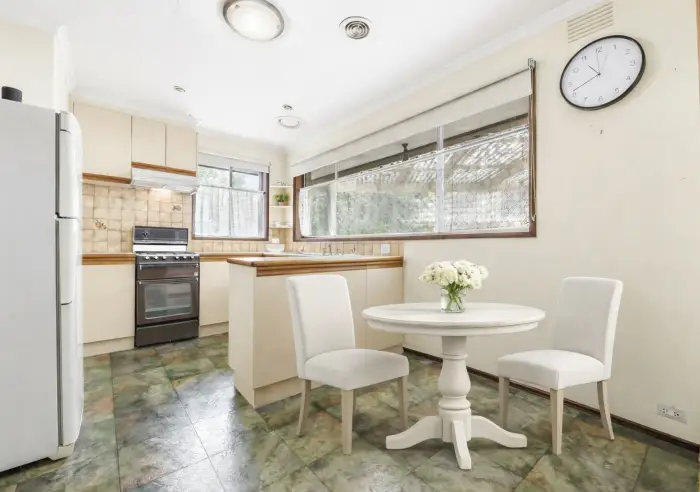The kitchen is functional and well-equipped with a breakfast nook, timber laminate cabinetry, storage and vinyl flooring. The traditional tiled splash-back, 40mm laminate counter tops and spindle tapware adds character to the home. The home chef will appreciate the freestanding 600mm oven with gas burner cooktop and gourmet range-hood.