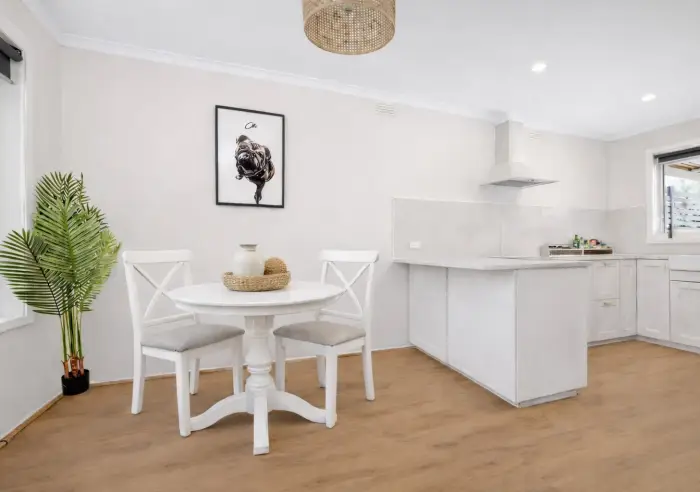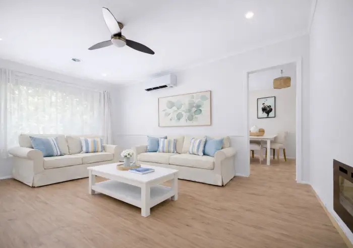Inside, quality updates create a warm and welcoming atmosphere, highlighted by high ceilings, an open-plan living layout and luxe timber-look laminate flooring throughout. Modern LED downlights, ceiling fans and roller blinds add style and functionality, while newly installed heating and cooling systems ensure year-round comfort. The living area is further enhanced by a sleek electric fireplace, creating a cosy focal point for relaxed evenings at home. A generous laundry adds everyday practicality.