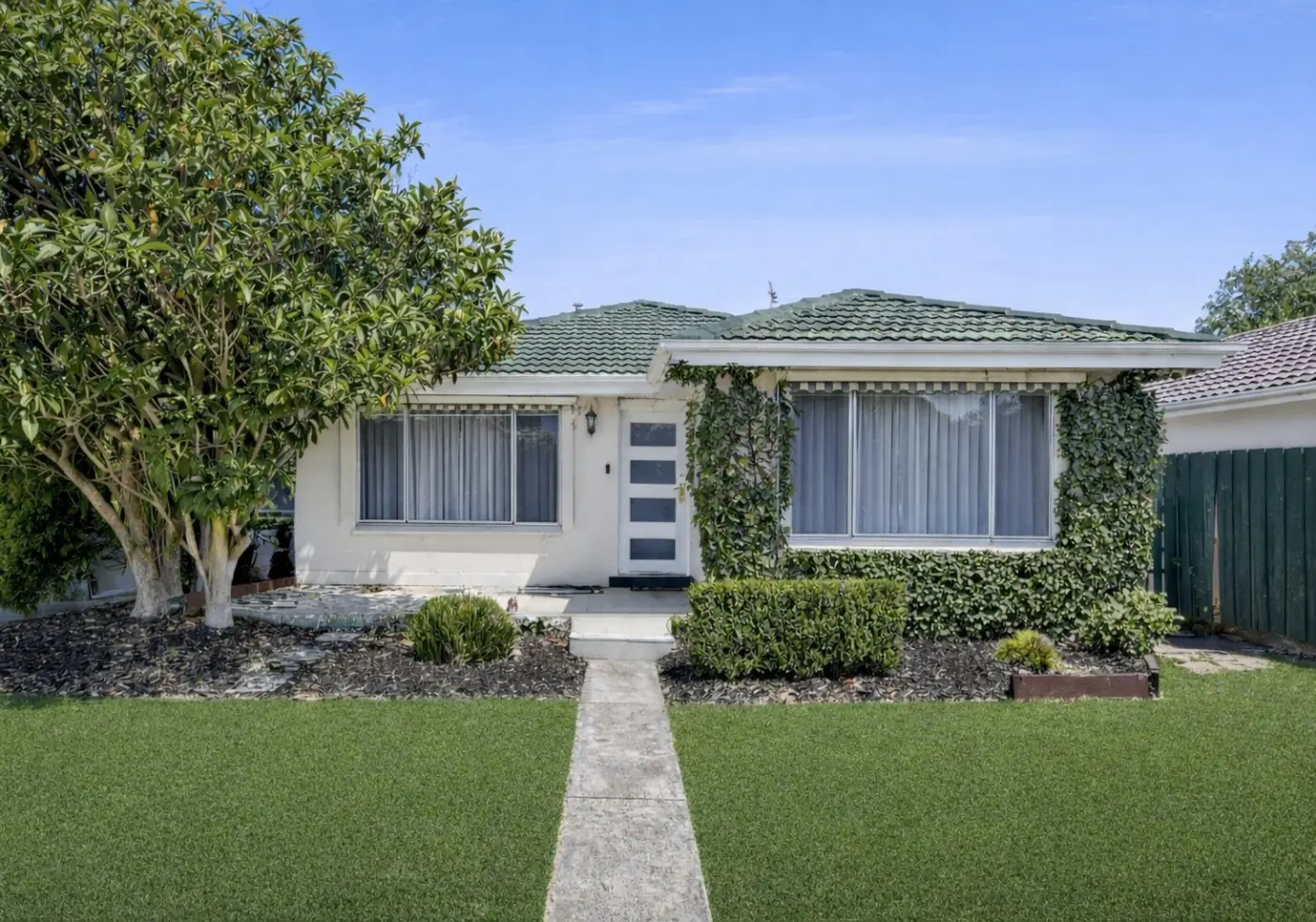 Set on a generous 530sqm (approx.) corner allotment, the single-level mid-century residence showcases a modest modernist form with a low horizontal profile, painted masonry and expansive aluminium-framed windows designed to maximise natural light. An inviting sunny porch, recessed central entry and new fencing with a sliding gate complement the home’s clean street presence.