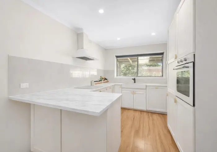 The kitchen is well appointed with a breakfast nook for casual dining, 40mm laminate benchtops, soft-close cabinetry and ample storage. Cooking is a pleasure with a 600mm electric cooktop, built-in oven, gourmet rangehood and dishwasher. Accommodation includes three spacious bedrooms, highlighted by a master with walk-in robe. The stylish central bathroom features full-height wall tiles, a semi-frameless shower, ceramic-top vanity and a freestanding bathtub, while a separate powder room adds convenience.